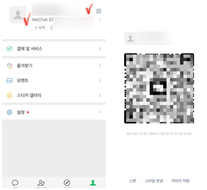 마이페이지에 가입한 위챗 ID가 생성되고 QR코드를 누르면